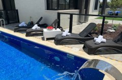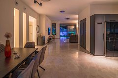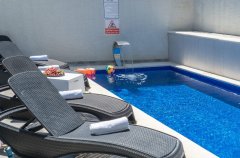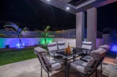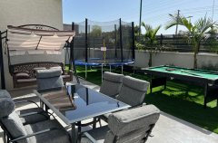 וילת נופש יוקרתית עם 5 חדרי שינה מרווחים, 4 חדרי רחצה מאובזרים, בריכה בנויה ומחוממת עם גידור מלא, מיטות שיזוף נוחות, פינות ישיבה בגינה ופינת מנגל בחוץ