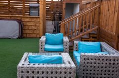 סאונה יבשה מרגיעה, חצר עם פינות ישיבה ומיטות שיזוף.