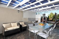 חצר גדולה עם פינות ישיבה, מיטות שיזוף ופינת מנגל מקצועית.