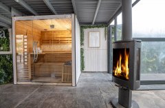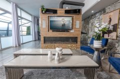 קמין גז דו צדדי, גג מיוחד, עיצוב מודרני ויוקרתי, בריכה מחוממת גדולה וחיבור של ג'קוזי זרמים לבריכה.