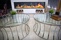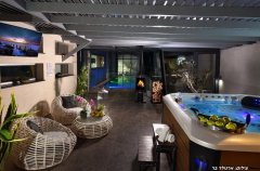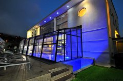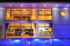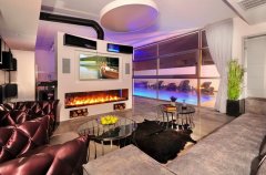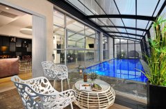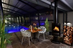 קמין גז דו צדדי, גג מיוחד, עיצוב מודרני ויוקרתי, בריכה מחוממת גדולה וחיבור של ג'קוזי זרמים לבריכה.